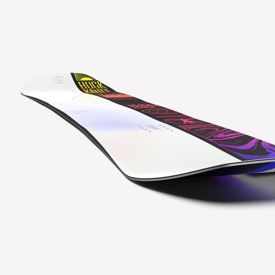 A dynamic, camber-dominant profile with a more aggressive load outside of the feet for snap and response, and a mellower, more forgiving load between the feet.