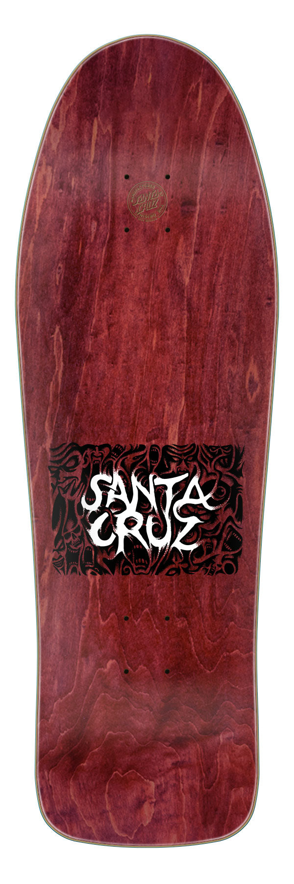 Santa Cruz Skateboards Tom Knox Firepit Reissue deck featuring fully remastered spot matte graphics on classic burgundy stained veneers with 2024 Reissue decktop laser etched logo.