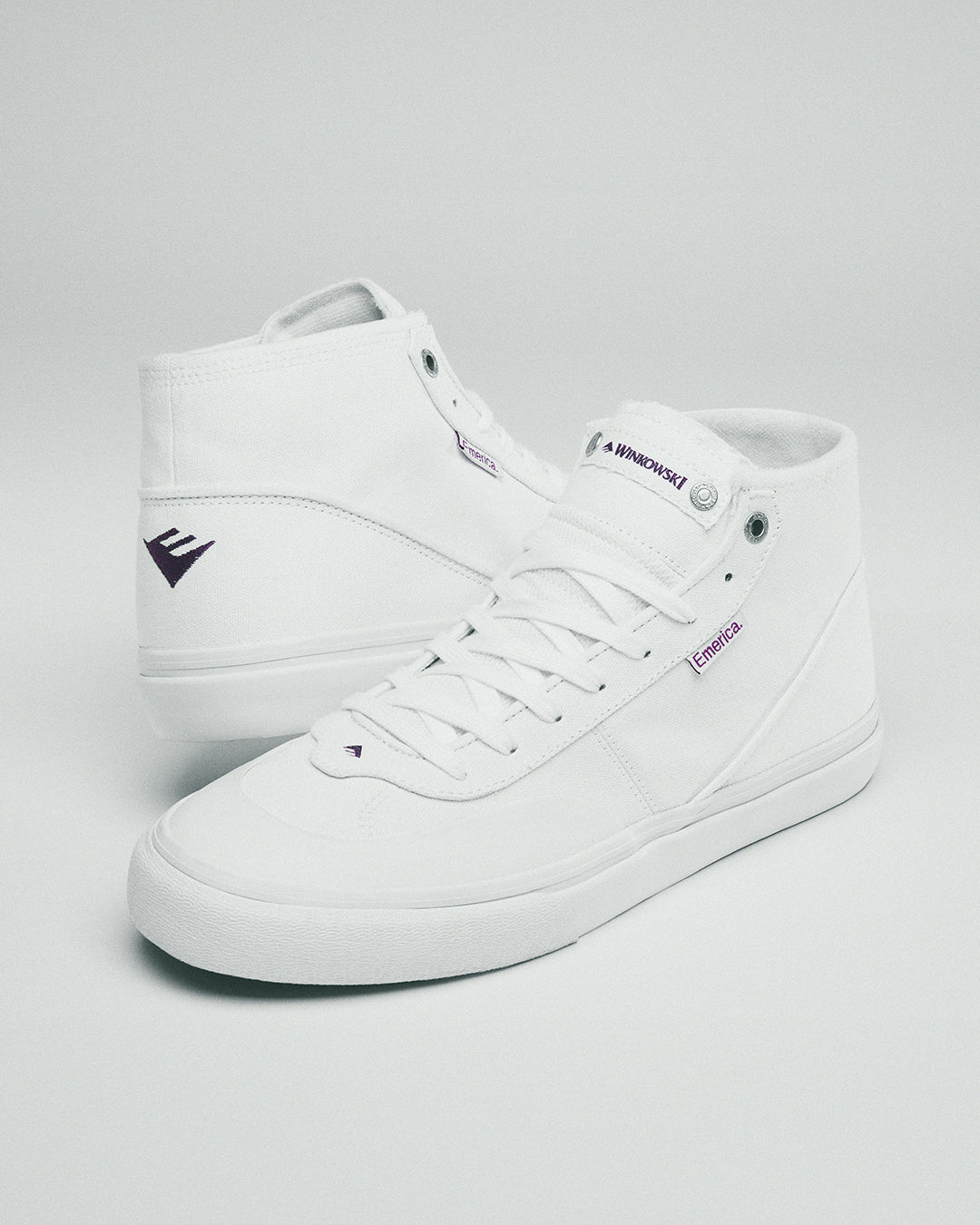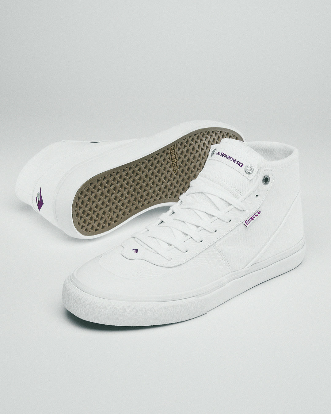 ERICK WINKOWSKI’S SKATING IS A SIGHT TO BEHOLD. AN EXPLOSIVE TWIST TO THE TRICKS OF YESTERYEAR WITH A STYLE ALL HIS OWN. WHEN DESIGNING HIS FIRST SIGNATURE SHOE, WINKOWSKI TOOK A SIMILAR PATH, ADDING HIS FLAIR TO A CLASSIC HIGH-TOP SILHOUETTE. THE WINKOWSKI FEATURES A DECONSTRUCTED COLLAR FOR ANKLE SUPPORT THAT ISN’T TOO STIFF. EXTERNAL TONGUE STASH POCKET AND TONGUE CENTERING STRAPS ENSURE YOUR FOOT AND YOUR GOODS REMAIN SECURE. A RUBBER TOE CAP AND DOUBLE-WRAPPED VULCANIZED SOLE PROVIDE EXCELLENT DURABILITY. G6 POLYURETHANE INSOLES ADD COMFORT AND SUPERIOR IMPACT CUSHIONING. WORKWEAR-INSPIRED CUSTOM RIVETS AND A CUSTOM EMBROIDERED UPSIDE-DOWN TRIANGLE LOGO PROVIDE THE FINISHING TOUCHES TO THIS MODERN CLASSIC. THE WHITE COLORWAY FEATURES PHOTO’S OF ERICK’S DOG, GEORGIA, ON THE INSOLES AS WELL AS HER NAME WRITTEN IN ERICK’S HANDWRITING EMBROIDERED ON THE COLLAR LINING.