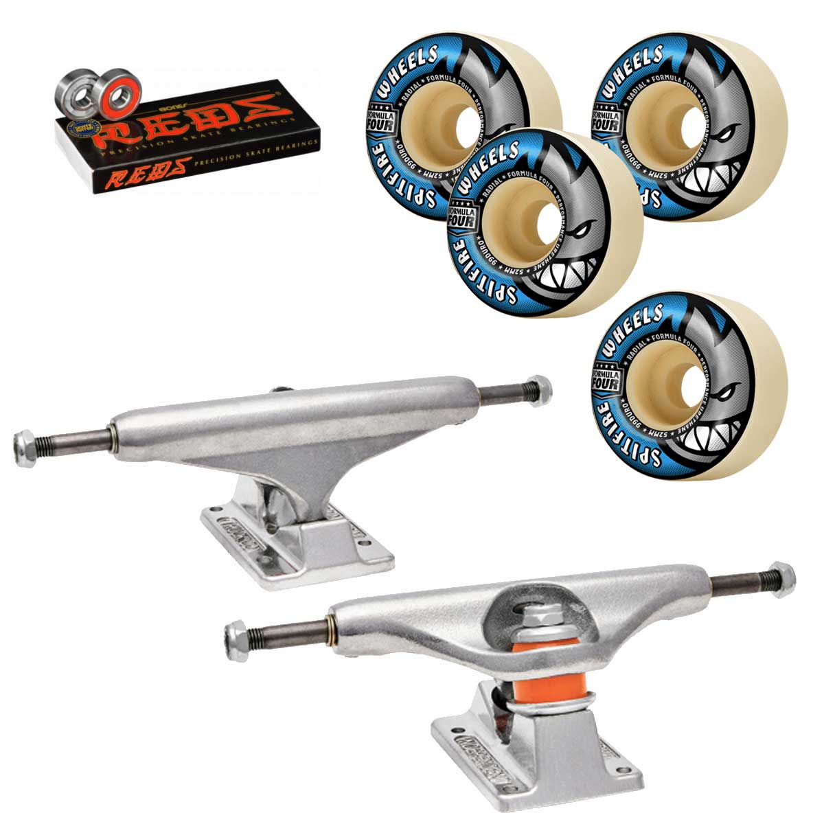 - Pro complete: Spitfire F4 or Bones Pro Wheels, Reds Bearings and Indy Raw Trucks.
