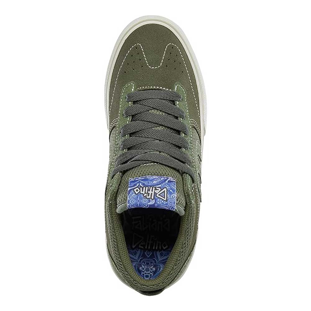 Fabiana Delfino's Windrow Vulc Mid Signature Colorway Pays. Homage to Her Hometown of Boca Raton, Florida. The Olive Green Embossed Suede is Inspired by the Local Alligators while the Blue Tongue Label and Insole Graphic Represents the Bandana She Wears. The Tongue and Quarter Panels are Also Customized with an Open Cell Mesh for Maximum Breathability.