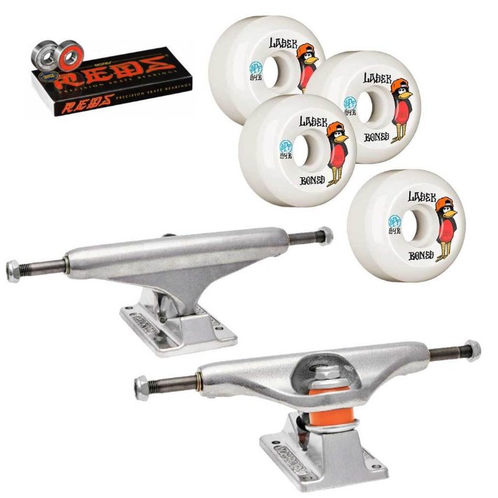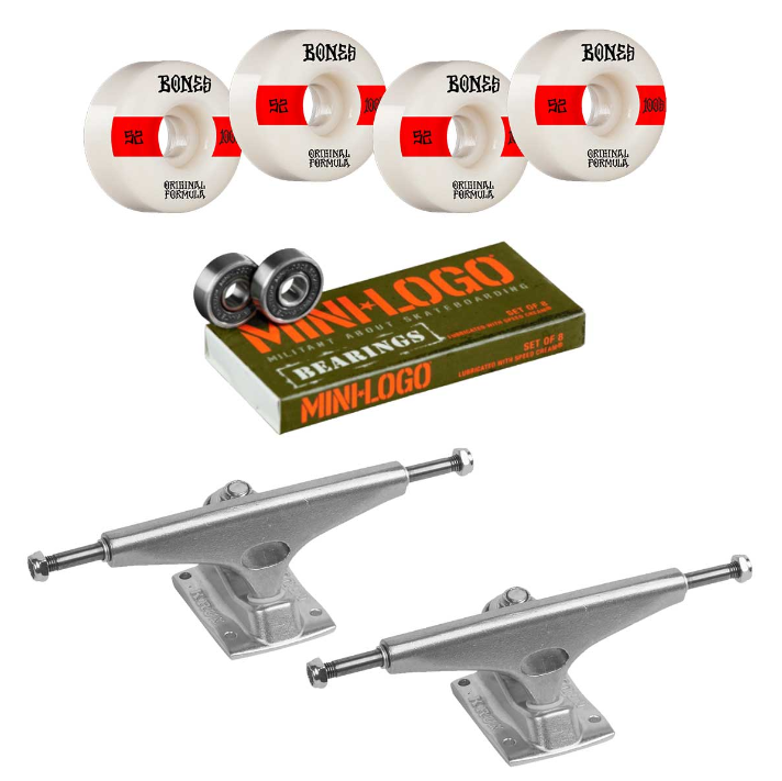 - Pro complete: Spitfire or Bones Pro Wheels, Reds Bearings and Indy Raw Trucks.
